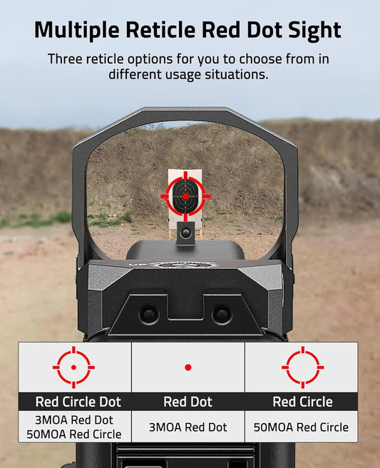 Multiple Reticle Red Dot Sight with Motion Awake Technology – Compact Handgun Sight with Side Battery Mount and Integrated Fiber Optic
