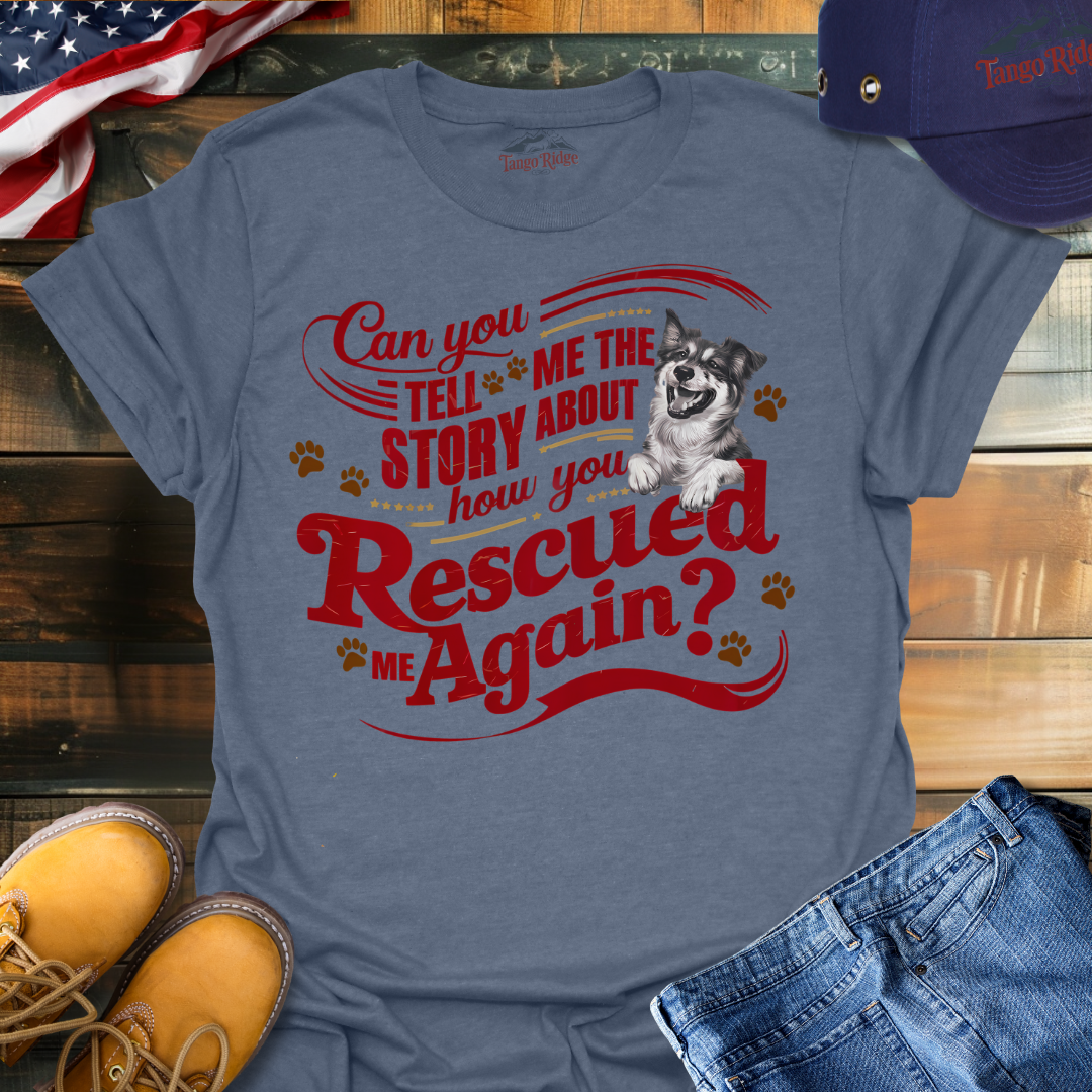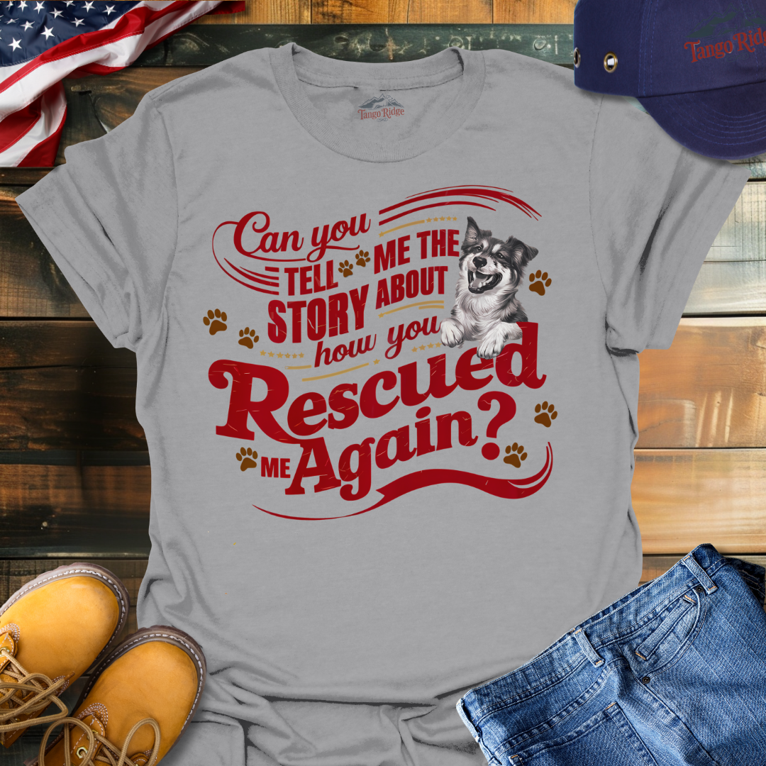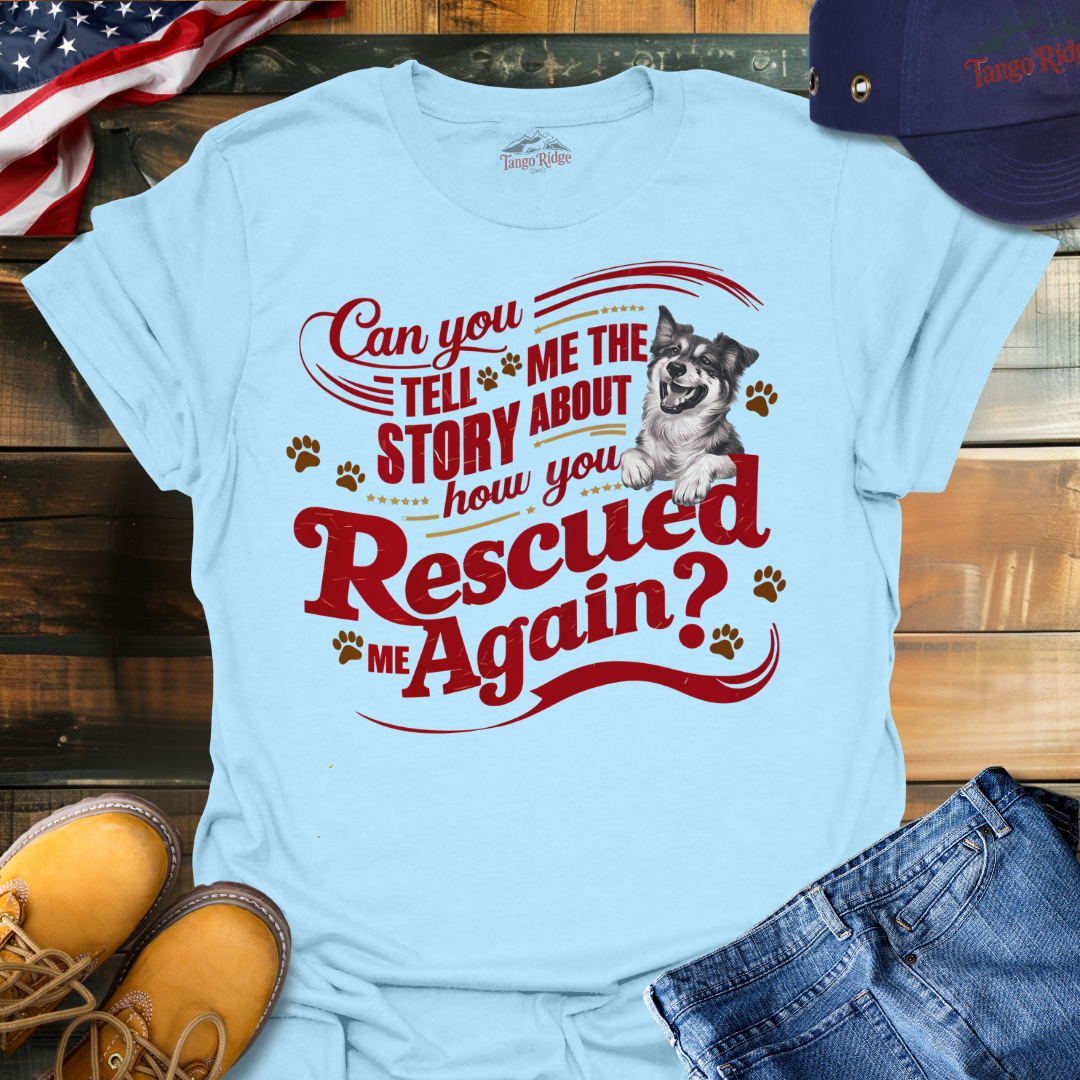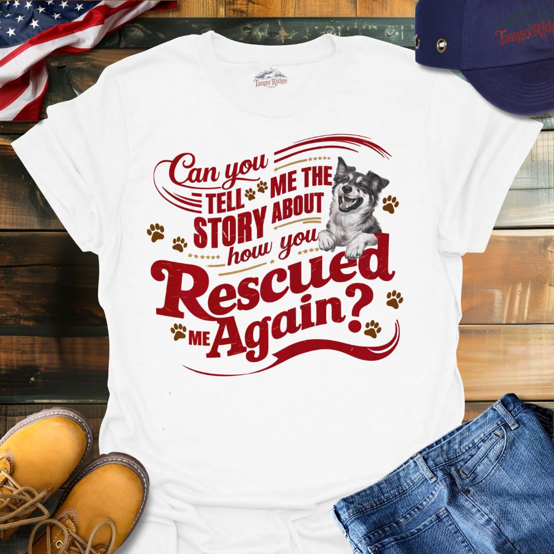 Heartwarming Story: The phrase "Can You Tell Me the Story About How You Rescued Me Again?" captures the special bond and cherished memories of adopting a rescue dog. This tee celebrates the heartfelt connection and joy of giving a dog a second chance.