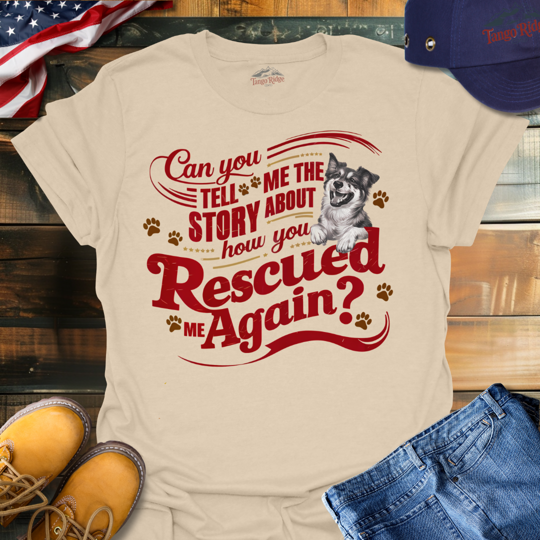 Celebrate the beautiful rescue story with your furry friend. Wear this tee proudly and let everyone know the joy of "Can You Tell Me the Story About How You Rescued Me Again?"