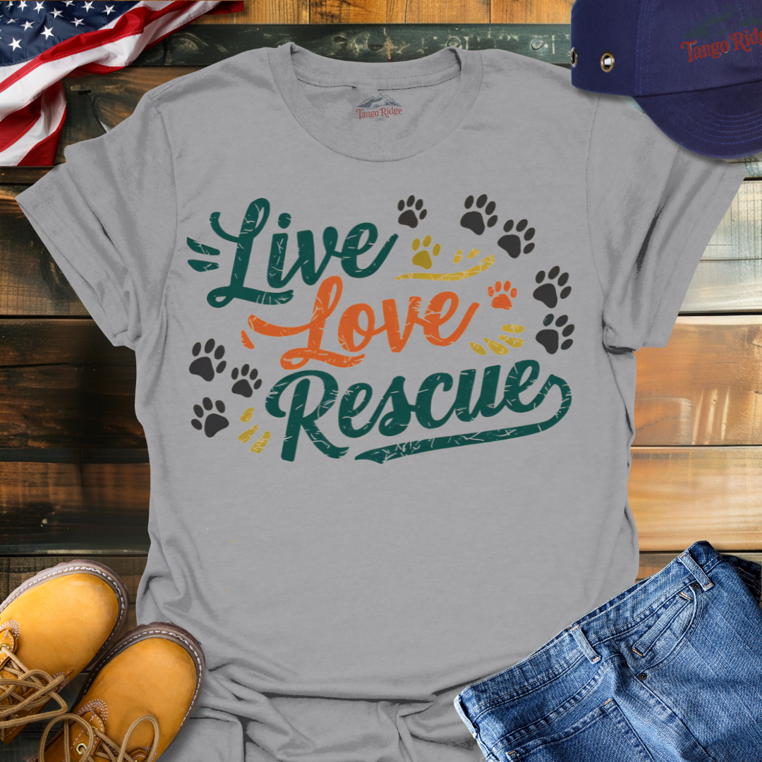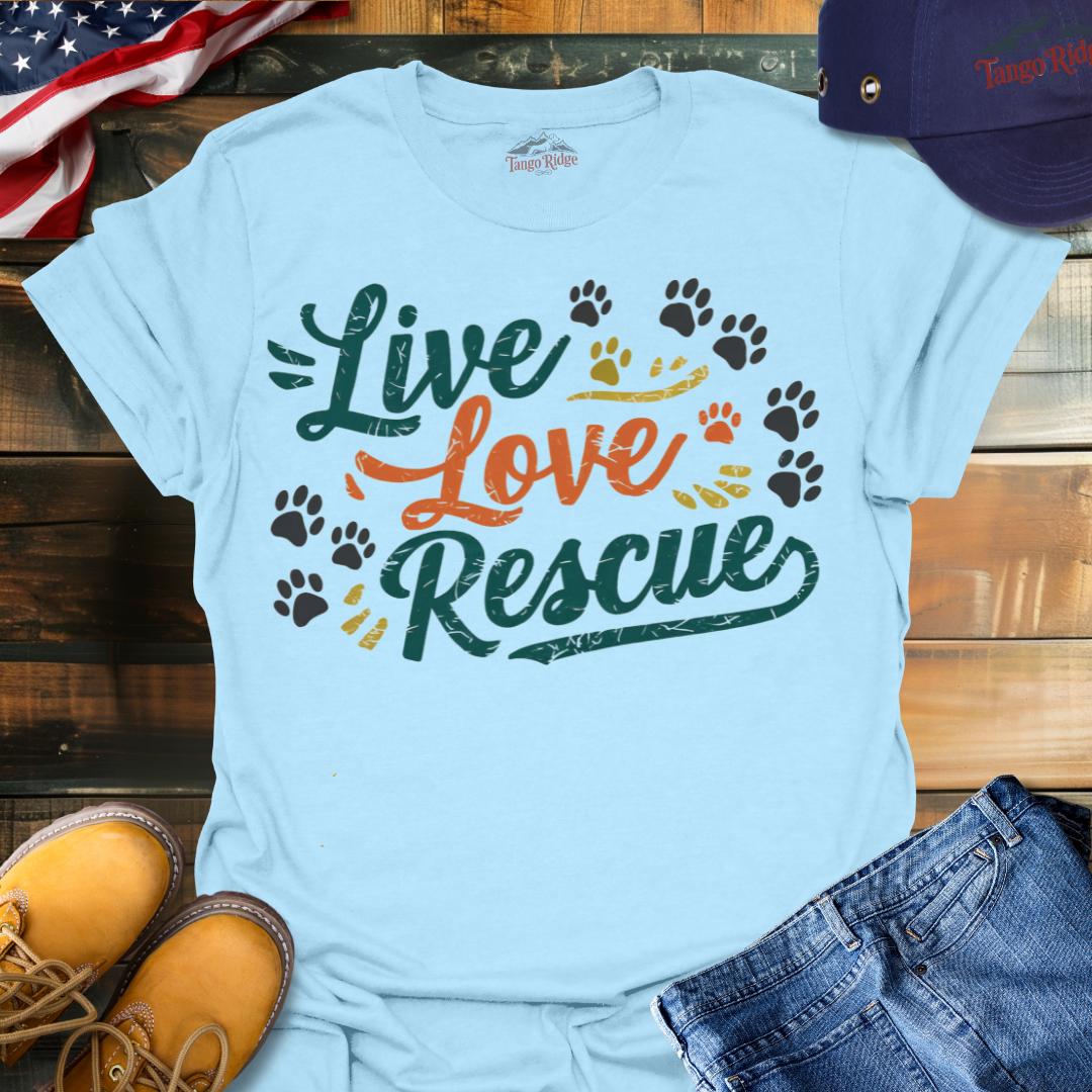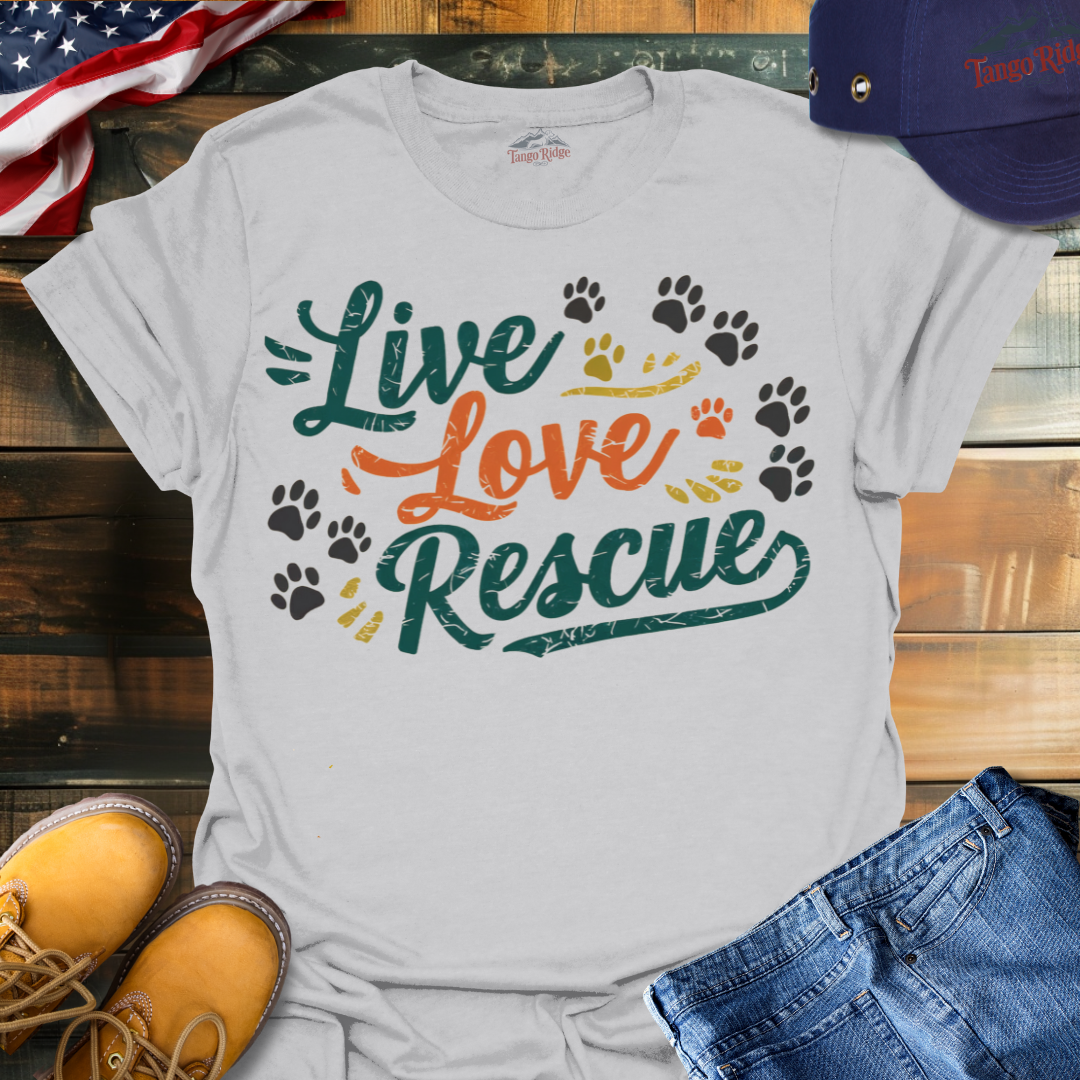Live with Purpose: The phrase "Live, Love, Rescue" embodies the lifestyle and passion of those dedicated to animal rescue. This tee is a celebration of living life with love and compassion for our furry friends.