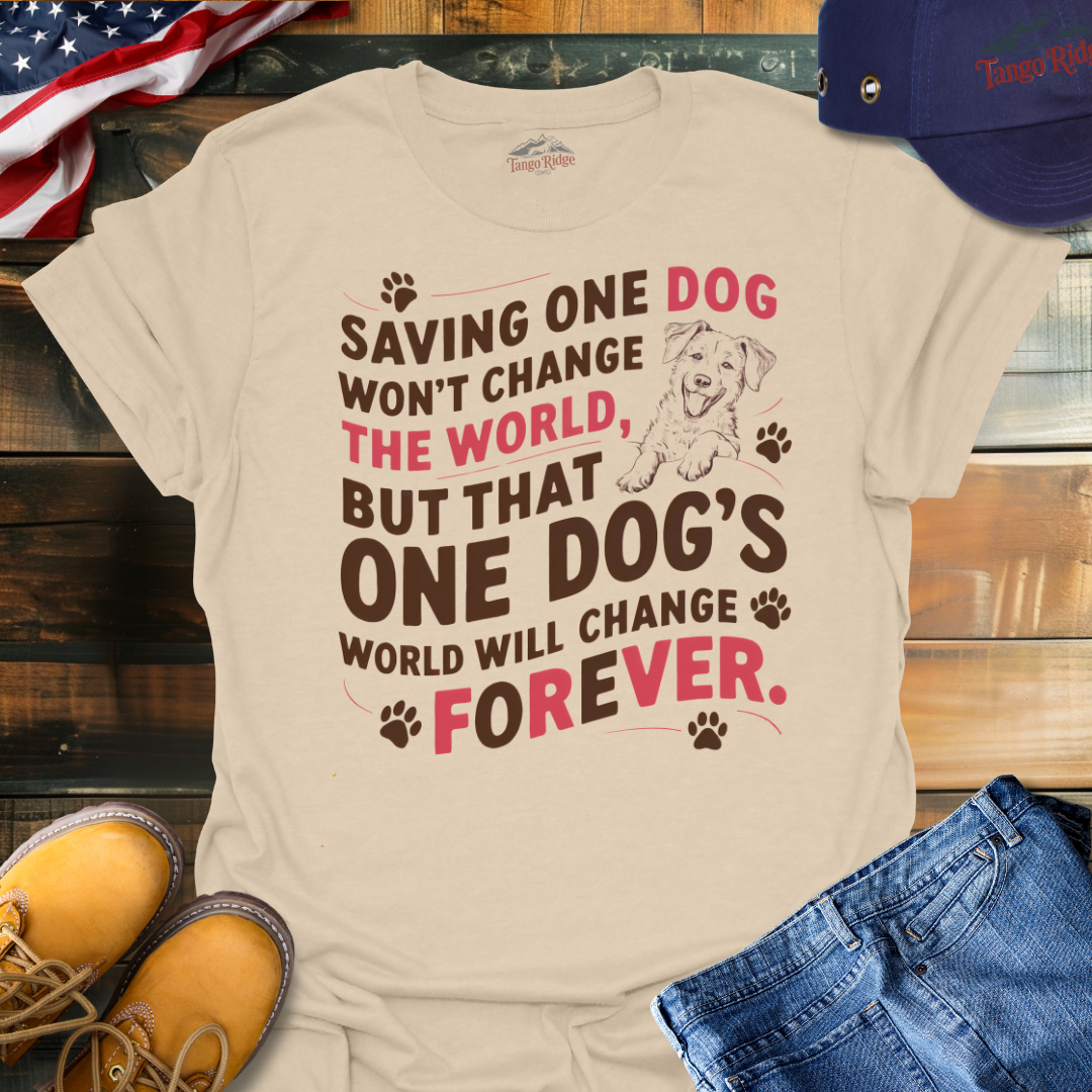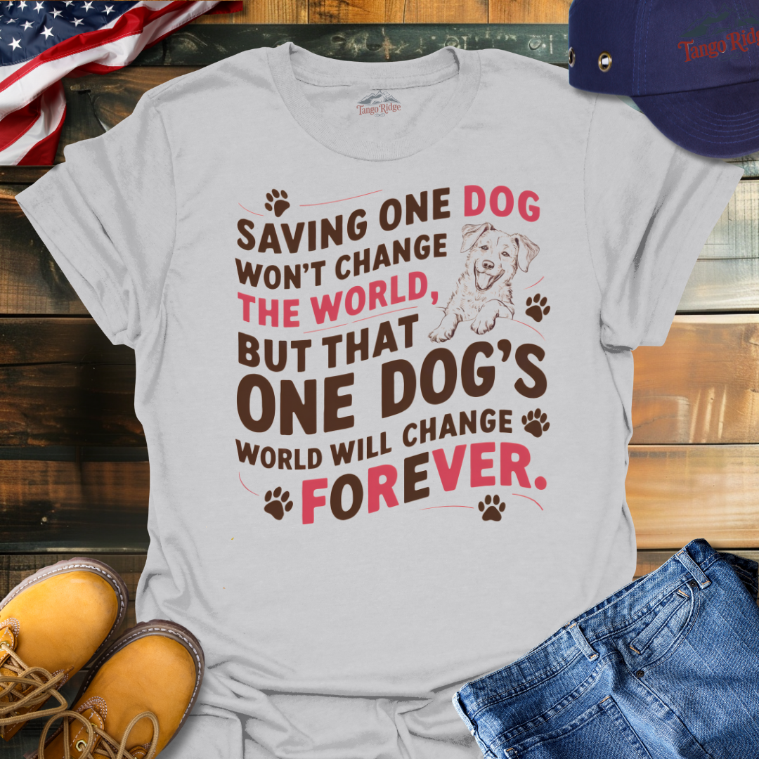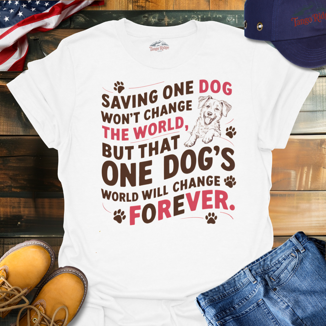 Life-Changing Impact: The phrase "Saving One Dog Won't Change the World, But That One Dog's World Will Change Forever" speaks to the profound difference rescuing a dog can make. This tee is perfect for anyone who understands the value of every single rescue.